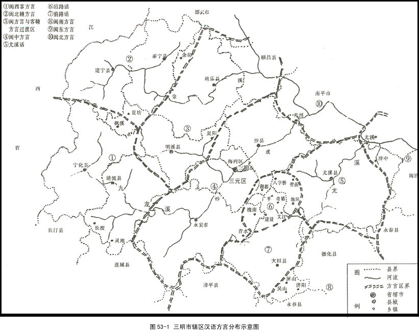 三明市辖九县一市二区今所通行的方言,在全国十大区汉语方言中占有3种:闽方言、客方言和赣方言。属于闽方言的又有闽中、闽南、闽东、闽北4个区和3个过渡小区;属于客方言的是闽西客方言区的一部分;属于赣方言的是和赣东方言连片相近的闽西北赣方言区的一部分。在闽方言和客、赣方言之间还有一个过渡区。这10种大小方言之间均不能通话。